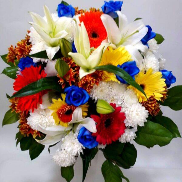 An impressive colorful bouquet of blue roses, red and yellow gerberas, orange chrysanthemums and white oriental. All these wonderful flowers make your gift unique.