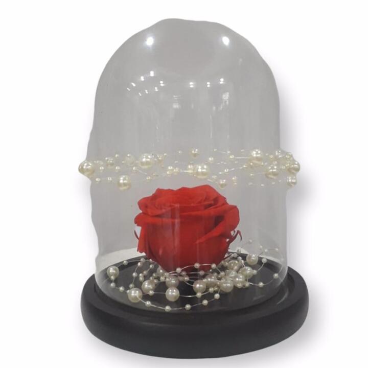 Dehydrated rose, in a red shade, placed in an impressive glass display.