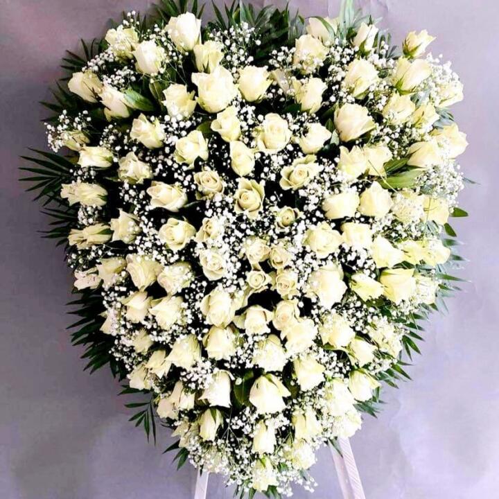 Express your sincere condolences for the loss of your loved one. Heart-shaped construction with roses and baby’s breath.