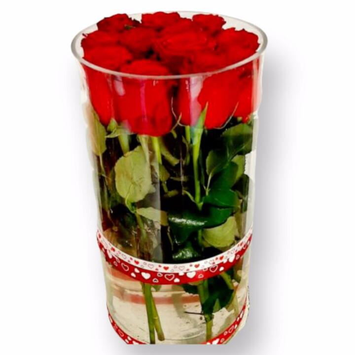 Unique and elegant composition of roses in a glass vase, which highlights incredibly beautifully the red roses of which it is composed.